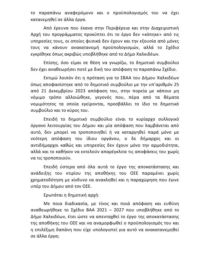 ❌Αν και το δημοτικό συμβούλιο αποφάσισε το έργο αυτό να ενταχθεί και να πληρωθεί από το ΣΒΑΑ της Χαλκίδας, η δημοτική αρχή σε κάποιο απροσδιόριστο χρονικό σημείο το αφαίρεσε αυθαίρετα και αντίθετα προς την εντολή που έλαβε από το δημοτικό συμβούλιο.
