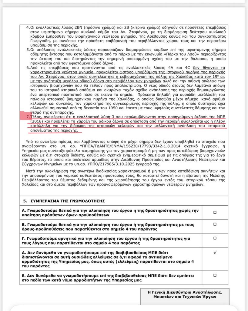 ⁃ Η αρχαιολογική υπηρεσία αξιολογεί ως επιβλαβή τη προτεινόμενη χάραξη πάνω στο παράκτιο μέτωπο, πάνω από τις πηγές της Αρεθούσας και πάνω από τα παλαιοβιομηχανικά κτίρια