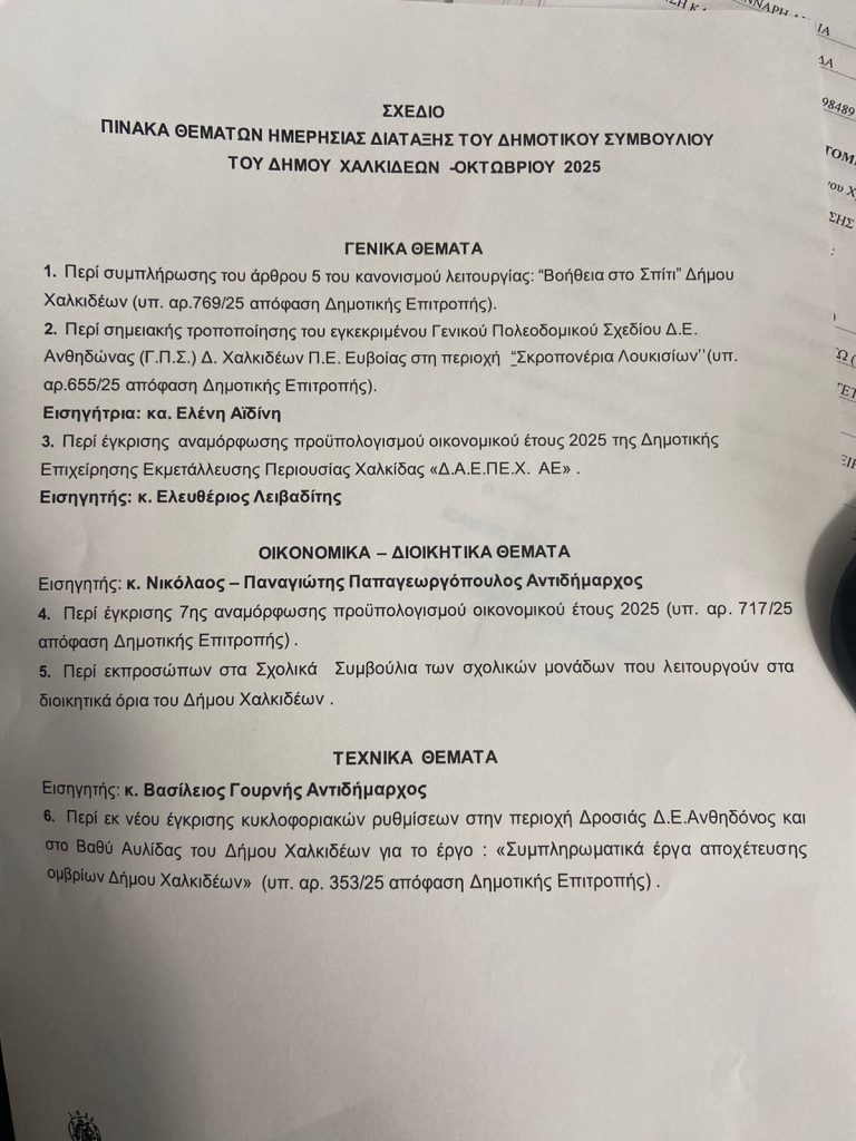 (παραθέτω το σχέδιο ημερησίας διάταξης που διανεμήθηκε στους δημοτικούς συμβούλους και δεν συμπεριλαμβάνει το θέμα αυτό).