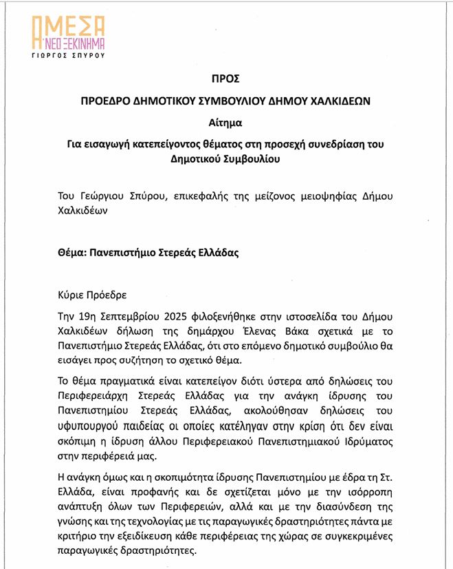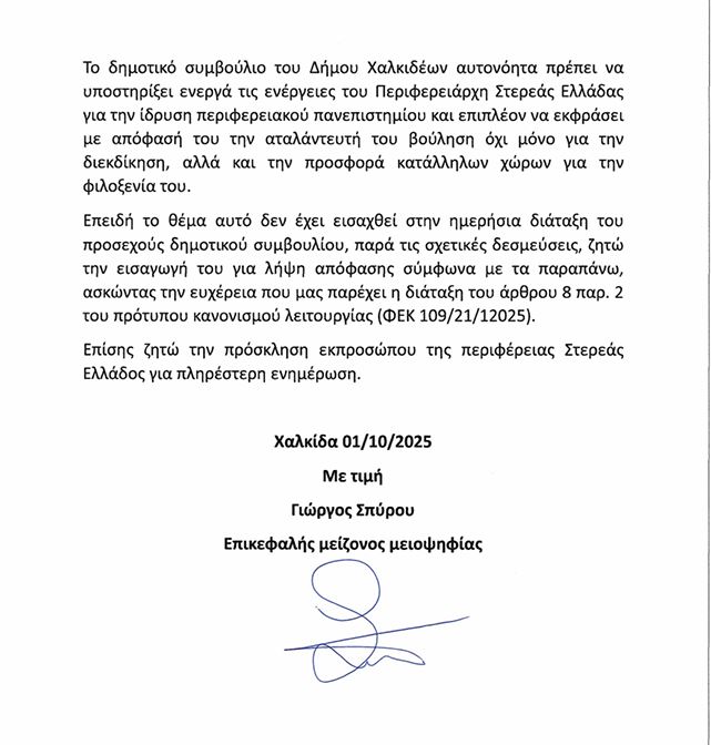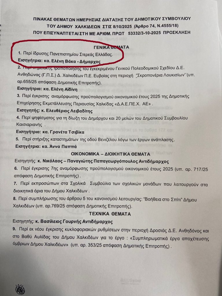 Να εισάγει δηλαδή προς συζήτηση στο δημοτικό συμβούλιο, το φλέγον θέμα του Πανεπιστημίου Στερεάς Ελλάδας.