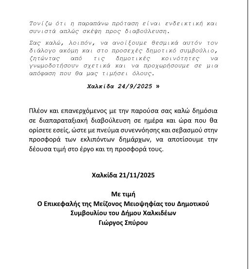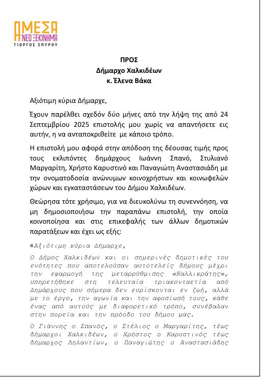 Μετά την επιστολή που απέστειλα στη Δήμαρχο Χαλκιδέων στις 24 Σεπτεμβρίου 2025 – η οποία έμεινε αναπάντητη επί σχεδόν δύο μήνες – θεώρησα θεσμικά επιβεβλημένο να επαναφέρω και πλέον να δημοσιοποιήσω το περιεχόμενό της για μια ουσιαστική συζήτηση και αποφάσεις σχετικά με την ονοματοδοσία ανώνυμων κοινόχρηστων χώρων και κοινωφελών εγκαταστάσεων προς τιμήν των εκλιπόντων δημάρχων Γιάννη Σπανού, Στέλιου Μαργαρίτη, Χρήστου Καρυστινού και Παναγιώτη Αναστασιάδη.