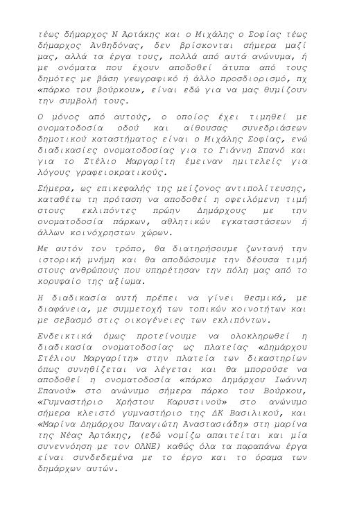 Σημειώνεται ότι η ονοματοδοσία ενός δρόμου και μίας πλατείας για τον Γιάννη Σπανό και τον Στέλιο Μαργαρίτη αντίστοιχα, παραμένει βαλτωμένη και ημιτελής πάνω από μια δεκαετία.